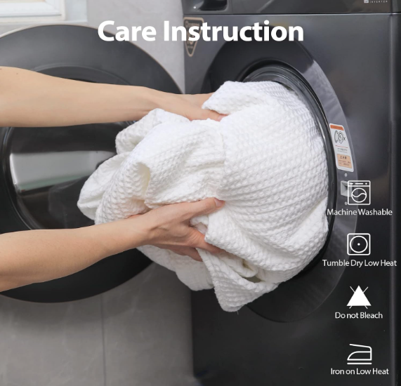 যত্নের নির্দেশাবলী – ওয়াফেল বুনন কম্বলগুলি সহজেই ধোয়া যায়, কারণ এটি সুতির কাপড়। কঠোর রাসায়নিক ব্যবহারের প্রয়োজন নেই। এগুলি শুকিয়ে বা শুকানোর জন্য ঝুলিয়ে রাখা যেতে পারে। সর্বোত্তম ফলাফল পেতে, প্রথম ব্যবহারের সাথে সাথে আলাদাভাবে ধোয়ার পরামর্শ দেওয়া হয়।